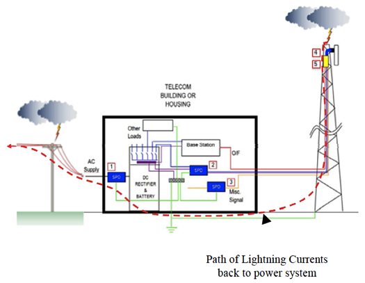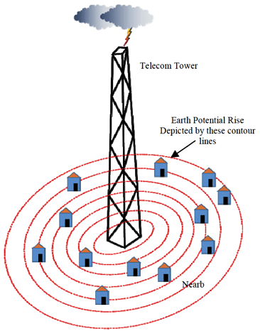 When lightning strikes a cell tower, the large amount of lightning current injected and dissipated in the earth near the tower can cause severe earth potential rise (EPR). It can drastically increase voltage gradients in the earth, even finding its way through the neutral and the earth electrodes into nearby dwellings.