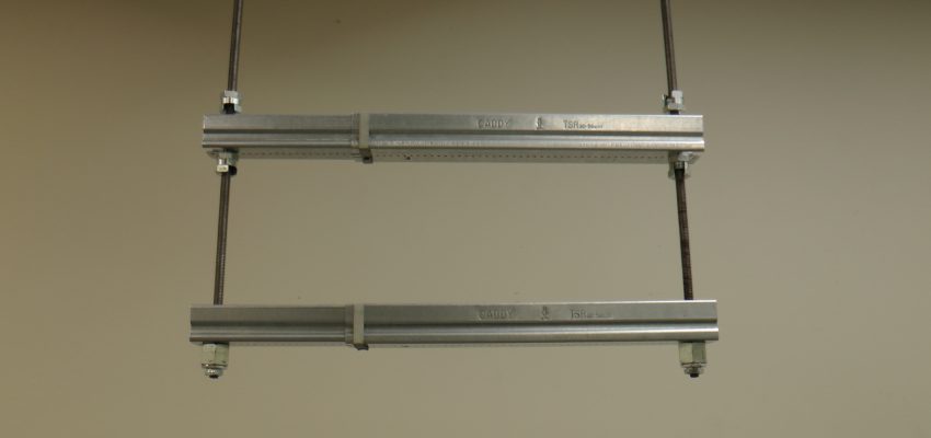 Attach four CADDY SN Nuts to the threaded rod above and below the space where the TSR is going to be installed. SN Nuts can be installed on the middle of the threaded rod without needing to be threaded up from the bottom. Thus, the bottom trapeze and everything it is holding can stay completly intact. Leave some space on the threaded rod between the nuts so there is room to install the bar.