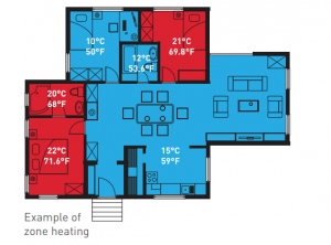 - Zoneable but due to the length of time required for warming, the zones do not offer “heat on demand”, reducing the possible maximum efficiency of the system