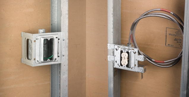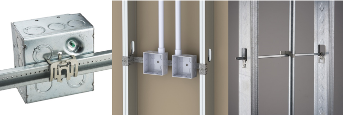 The single box-to-stud product offering includes several similar attributes including the snap-to-stud function allowing for fast and easy installation. These products adapt to the job that needs done, including accommodating all stud depths, working with standard or adjustable single and double gang mud rings and mounting to either side of the stud, with the ability to be mounted side-by-side on the same stud. Unique fold out tabs also eliminate the need to use scrap pieces of floor track to provide rigidity when mounting to the open face of studs.