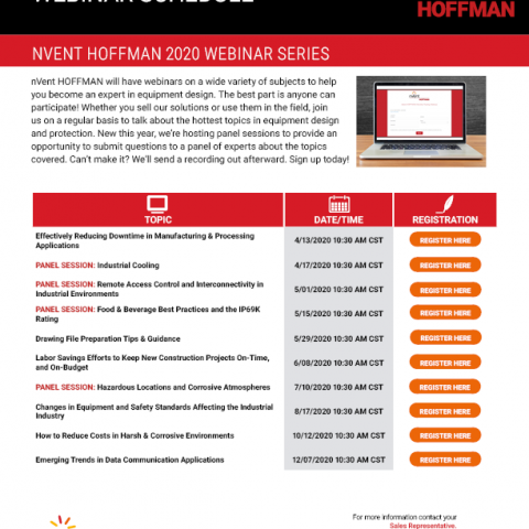 Además de las nuevas sesiones de MESA REDONDA, nVent HOFFMAN continuará su serie de seminarios web cada dos meses con cinco seminarios web restantes. Estos seminarios web son sesiones de 30 minutos que abordan una amplia variedad de temas para ayudarlo a convertirse en un experto en diseño de equipos. Los temas van desde cómo reducir al mínimo el tiempo de inactividad, los cambios en los equipos y las normas de seguridad hasta las prácticas recomendadas para entornos higiénicos. La mejor parte es que cualquiera puede participar. Independientemente de que usted venda nuestras soluciones o las utilice en su empresa, únase a los expertos de nVent HOFFMAN para analizar los temas más actuales en relación el diseño y la protección de equipos.