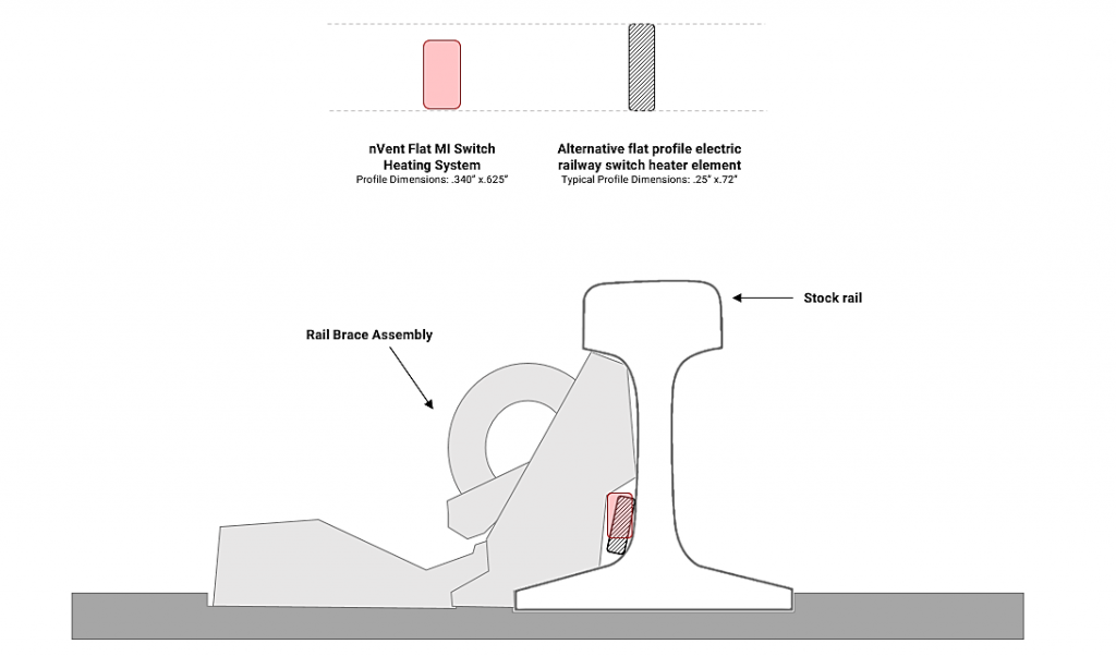 - Better Fit – The innovative heater design features a unique flat profile (.340″ x .625″) that is wider yet shorter in height than competitive heaters. By occupying less height, the nVent Flat MI Switch Heating System heater element is an easier fit in tight spaces, such as in between the stock rail and wedge brace located at the entrance of the turnout.